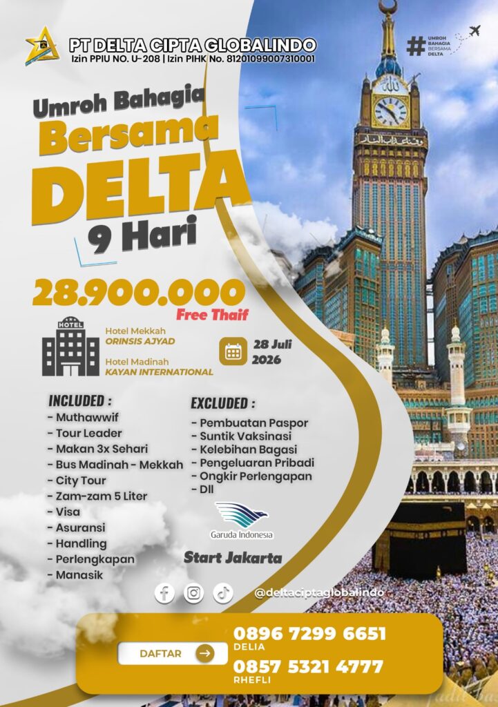 PT. Delta Cipta Globalindo adalah perusahaan penyelenggara perjalanan umroh dan haji khusus yang telah berpengalaman selama bertahun-tahun dalam memberikan pelayanan terbaik kepada jamaah. Kami menawarkan paket perjalanan yang nyaman dan aman, didukung oleh tim profesional yang siap membantu dan membimbing selama proses perjalanan. Dengan fasilitas yang lengkap dan harga yang kompetitif, Delta Cipta Globalindo berkomitmen untuk memastikan setiap jamaah dapat menjalankan ibadah dengan khusyuk dan tenang. Kepercayaan dan kepuasan jamaah adalah prioritas utama kami.